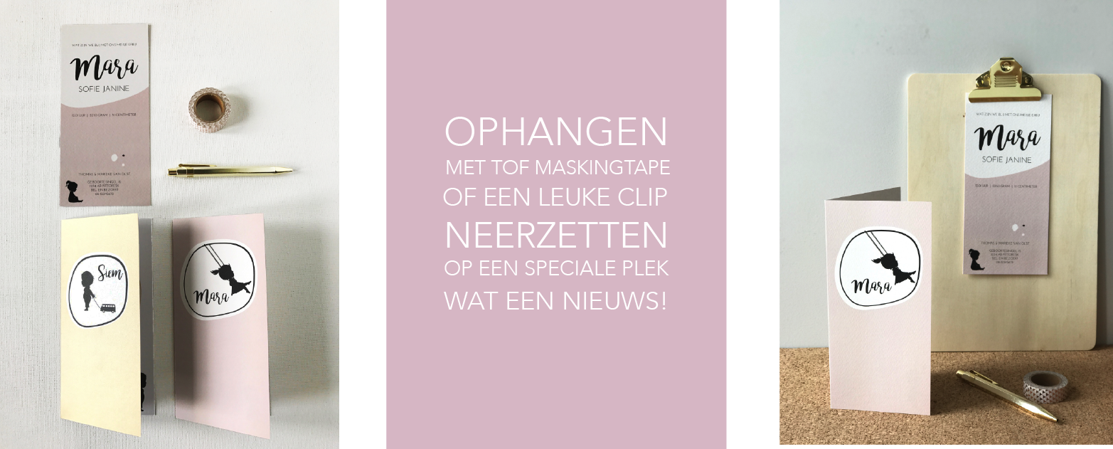 Heel eerlijk gezegd, showen deze geboortekaartjes nog mooier het grote geboorte-nieuws dan de andere formaten kaartjes. Dit komt omdat je ze neerzet of leuk ophangt met tape of een punaise. Zo kijk je recht op de kaart en is alle tekst goed te zien! Met name de naam staat zo goed in de spotlight en dat is juist de bedoeling!